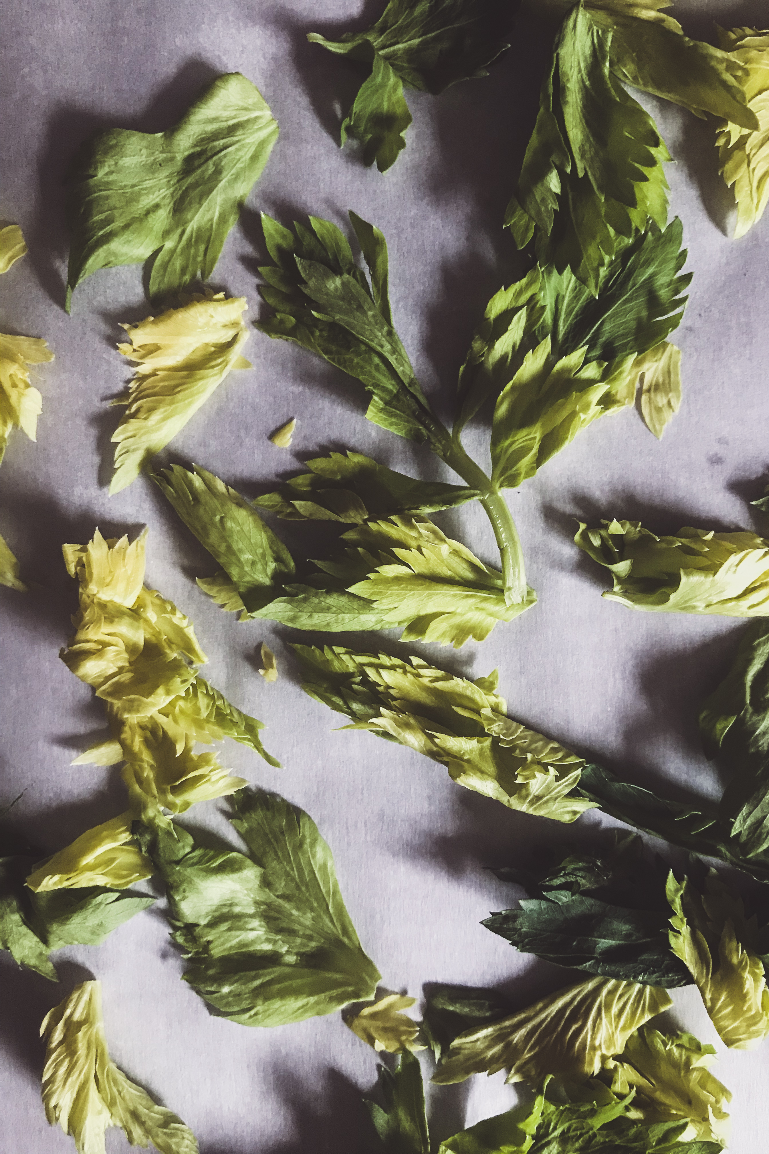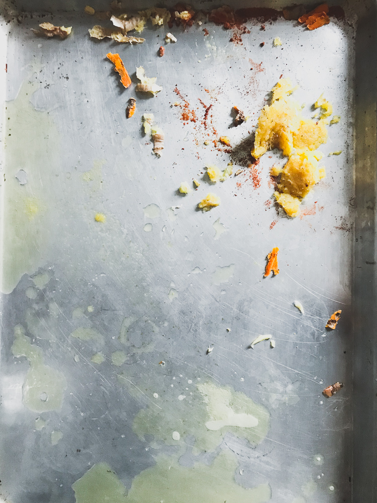 Remove all the leafy greens from your celery stalks. Dark and light ones, they’re all delicious! Rinse them under running water and spin dry. Line a baking tray with parchment paper and after the celery leaves have completely dried, lay them out in one single layer. It’s important that the celery leaves are dry before baking otherwise they will steam and not crisp up during the cooking process.